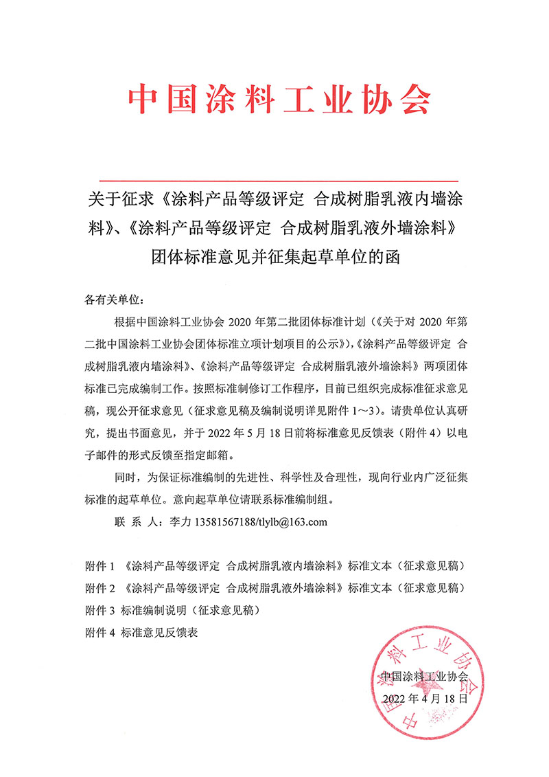 根据best365中国官方网站2020年第二批团体标准计划(《关于对2020年第二批best365中国官方网站团体标准立项计划项目的公示》),《涂料产品等级评定 合成树脂乳液内墙涂料》、《涂料产品等级评定 合成树脂乳液外墙涂料》两项团体标准已完成编制工作。按照标准制修订工作程序,目前已组织完成标准征求意见稿,现公开征求意见(征求意见稿及编制说明详见附件1~3)。请贵单位认真研究,提出书面意见,并于2022年5月18日前将标准意见反馈表(附件4)以电子邮件的形式反馈至指定邮箱。
