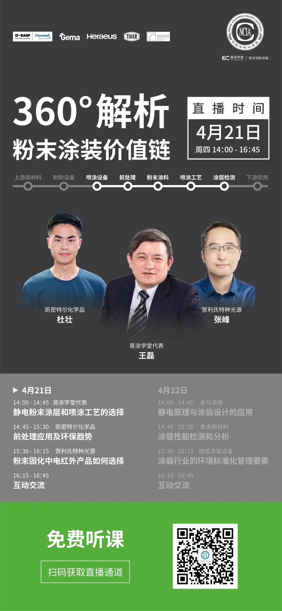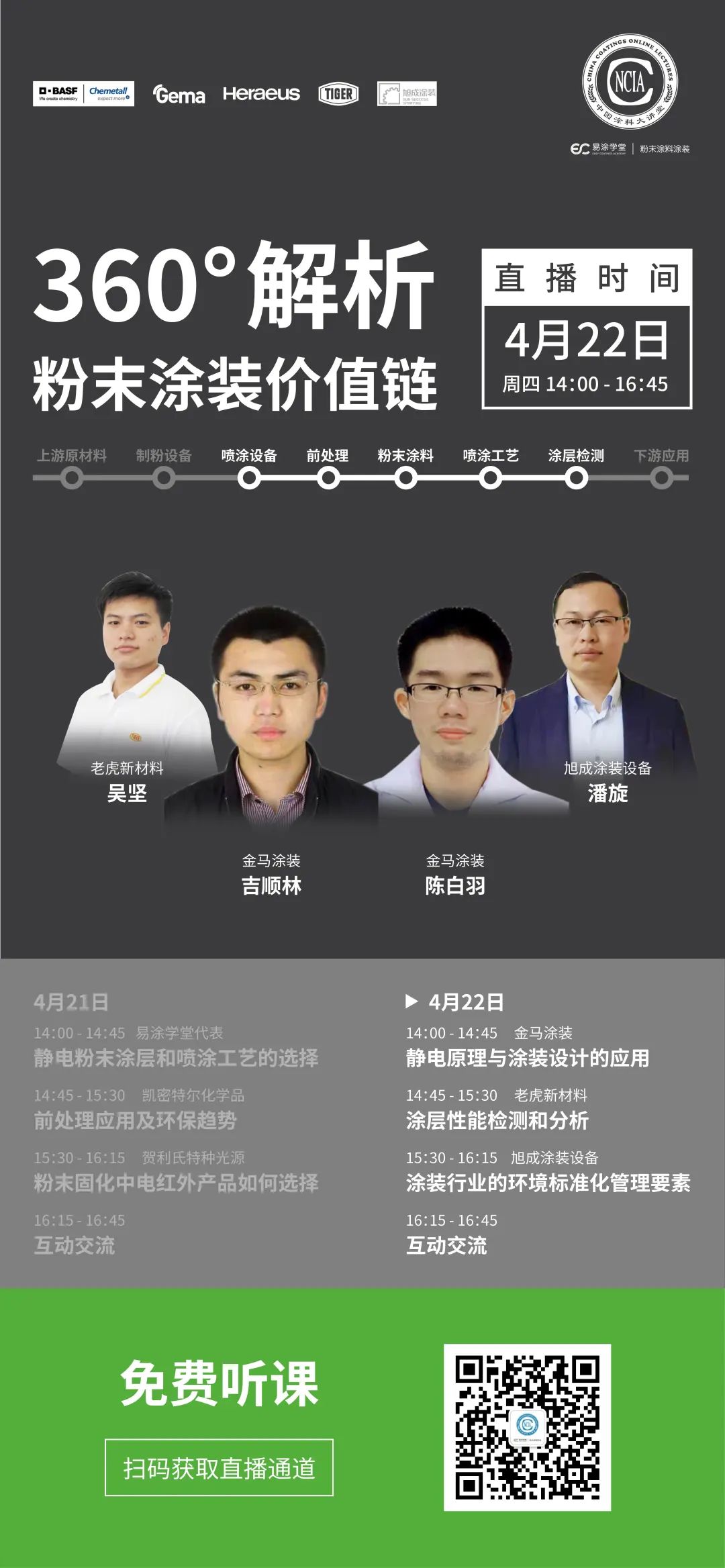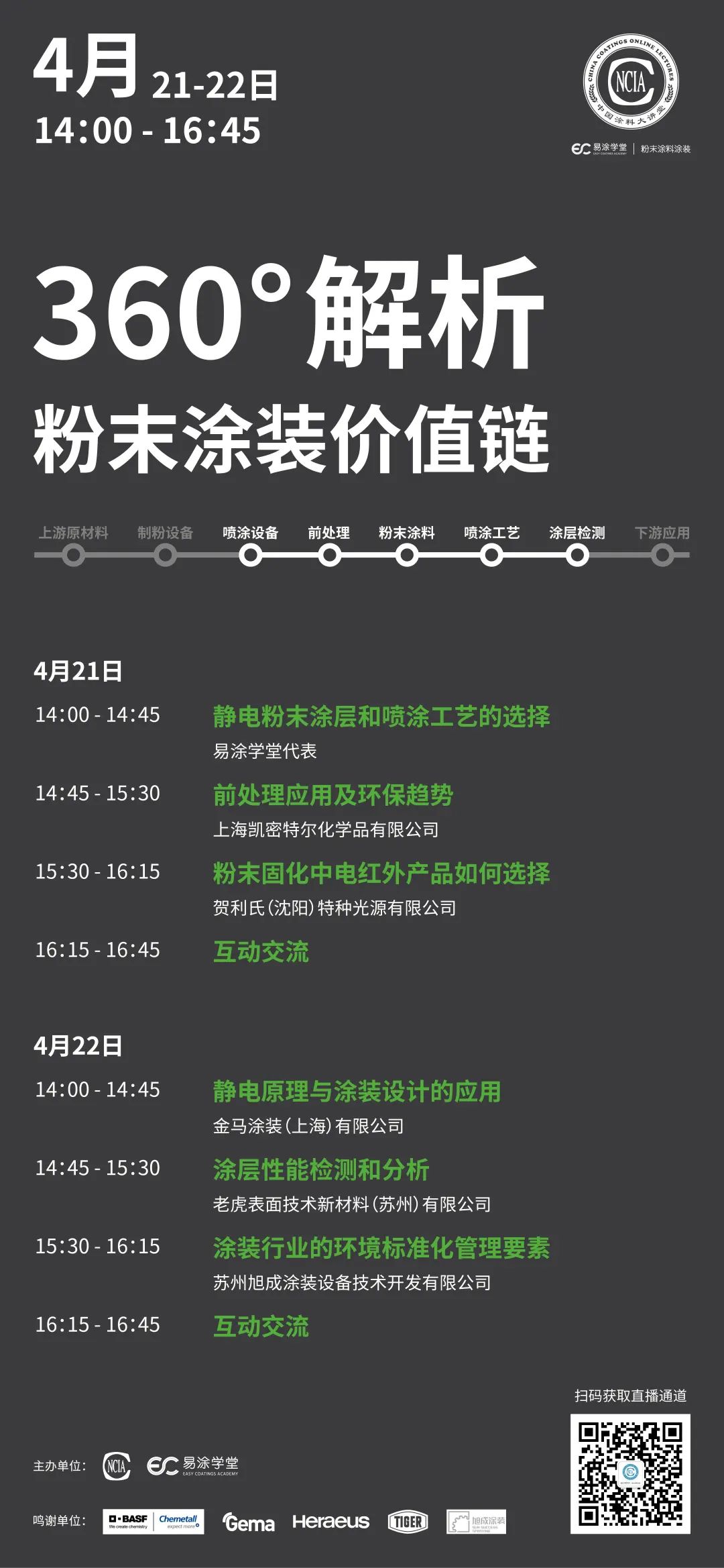 2022年4月21-22日,中国涂料大讲堂粉末涂料涂装版块-暨易涂学堂即将开讲,360°解析粉末涂装价值链。
