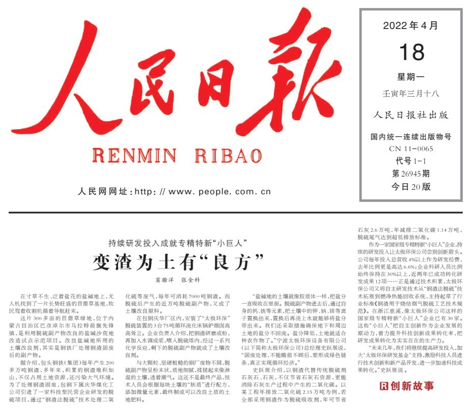 通过协会的牵线塔桥,2021年,协会走进会员企业——宁波太极环保设备有限公司开展了一系列专家进企业提供智力活动,有效实现了公司技术革新和突破。4月18日,宁波太极环保设备有限公司“钢渣法脱硫”技术《变渣为土有“良方”》一文荣登《人民日报》。