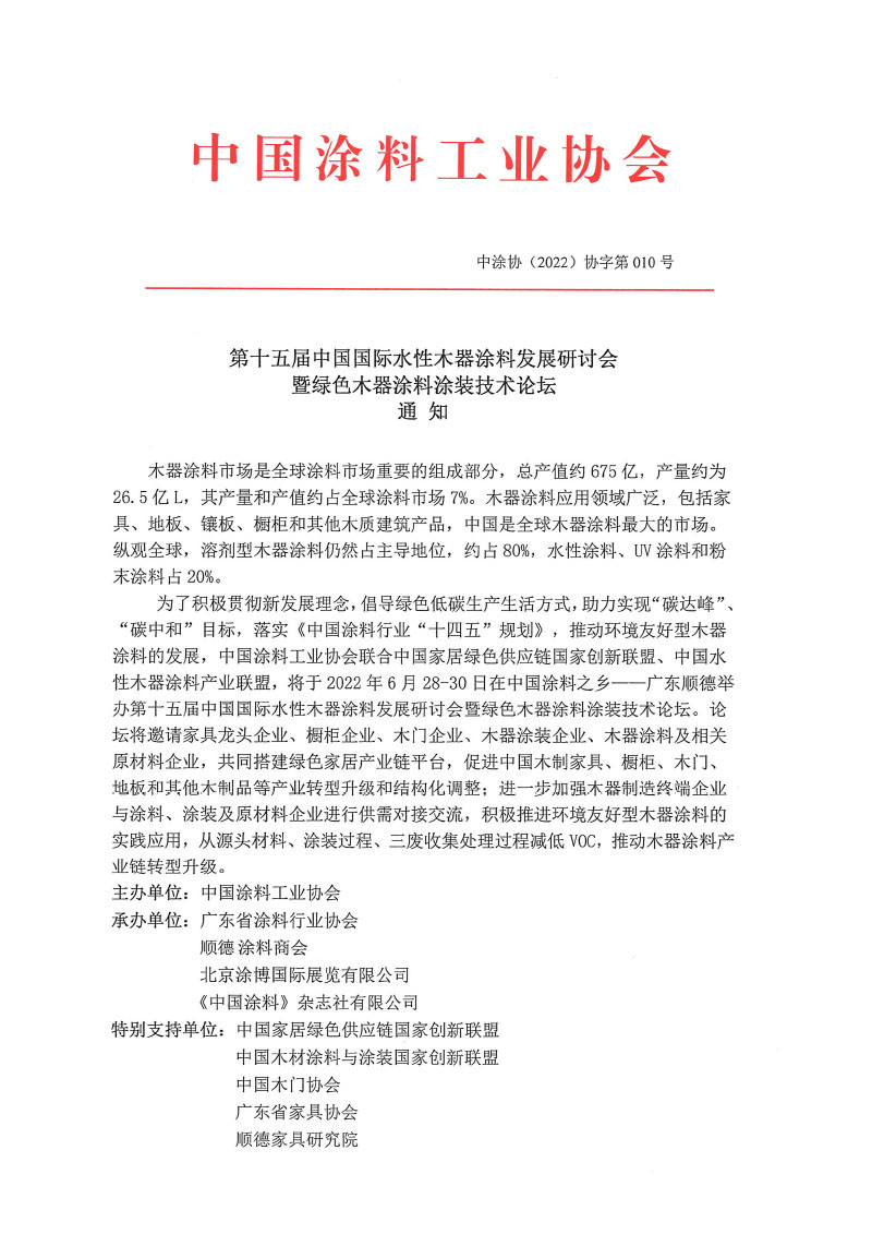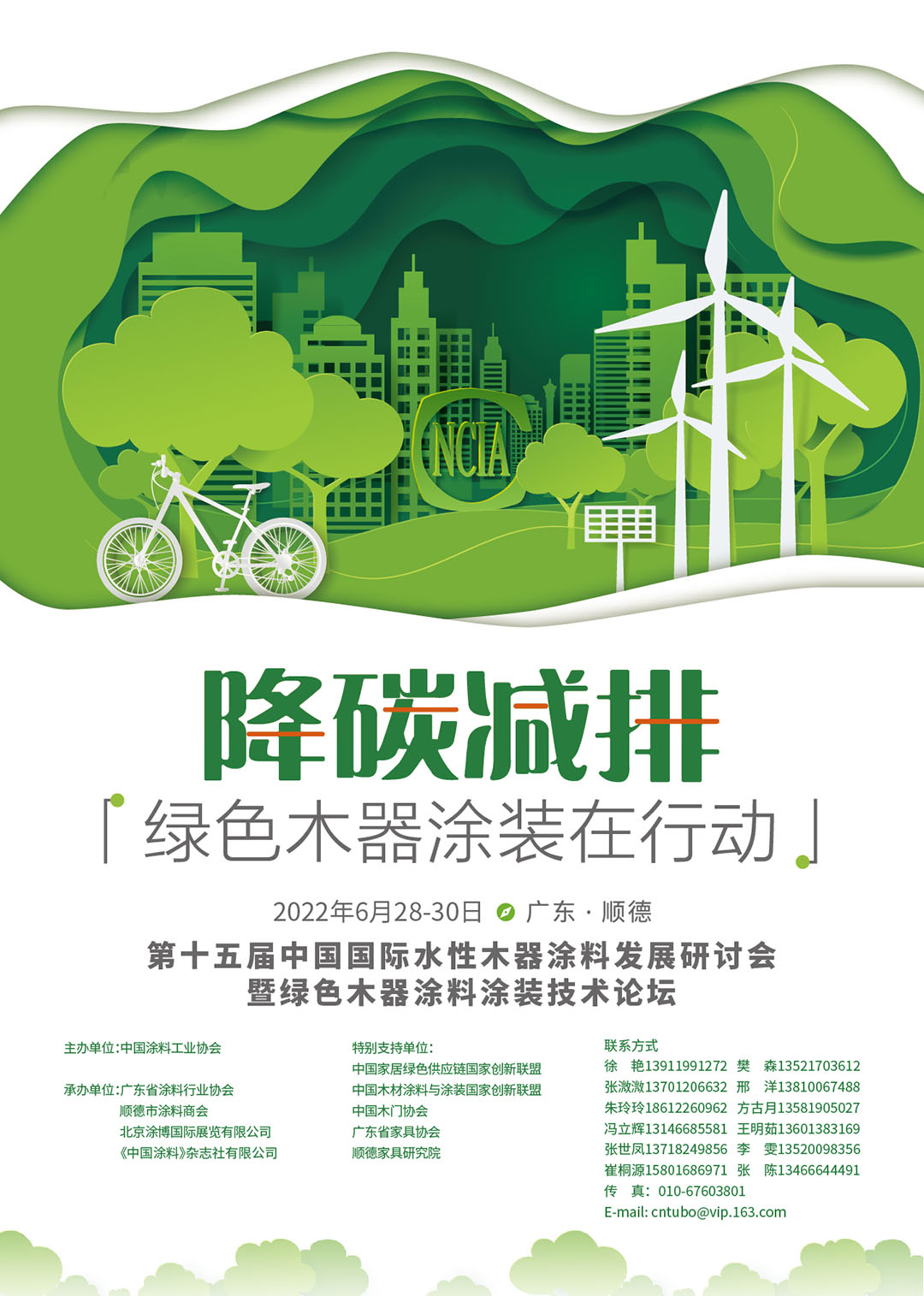 为了积极贯彻新发展理念,倡导绿色低碳生产生活方式,助力实现“碳达峰”、“碳中和”目标,落实《中国涂料行业“十四五”规划》,推动环境友好型木器涂料的发展,best365中国官方网站联合中国家居绿色供应链国家创新联盟、中国水性木器涂料产业联盟,将于2022年6月28-30日在中国涂料之乡——广东顺德举办第十五届中国国际水性木器涂料发展研讨会暨绿色木器涂料涂装技术论坛。论坛将邀请家具龙头企业、橱柜企业、木门企业、木器涂装企业、木器涂料及相关原材料企业,共同搭建绿色家居产业链平台,促进中国木制家具、橱柜、木门、地板和其他木制品等产业转型升级和结构化调整;进一步加强木器制造终端企业与涂料、涂装及原材料企业进行供需对接交流,积极推进环境友好型木器涂料的实践应用,从源头材料、涂装过程、三废收集处理过程减低VOC,推动木器涂料产业链转型升级。