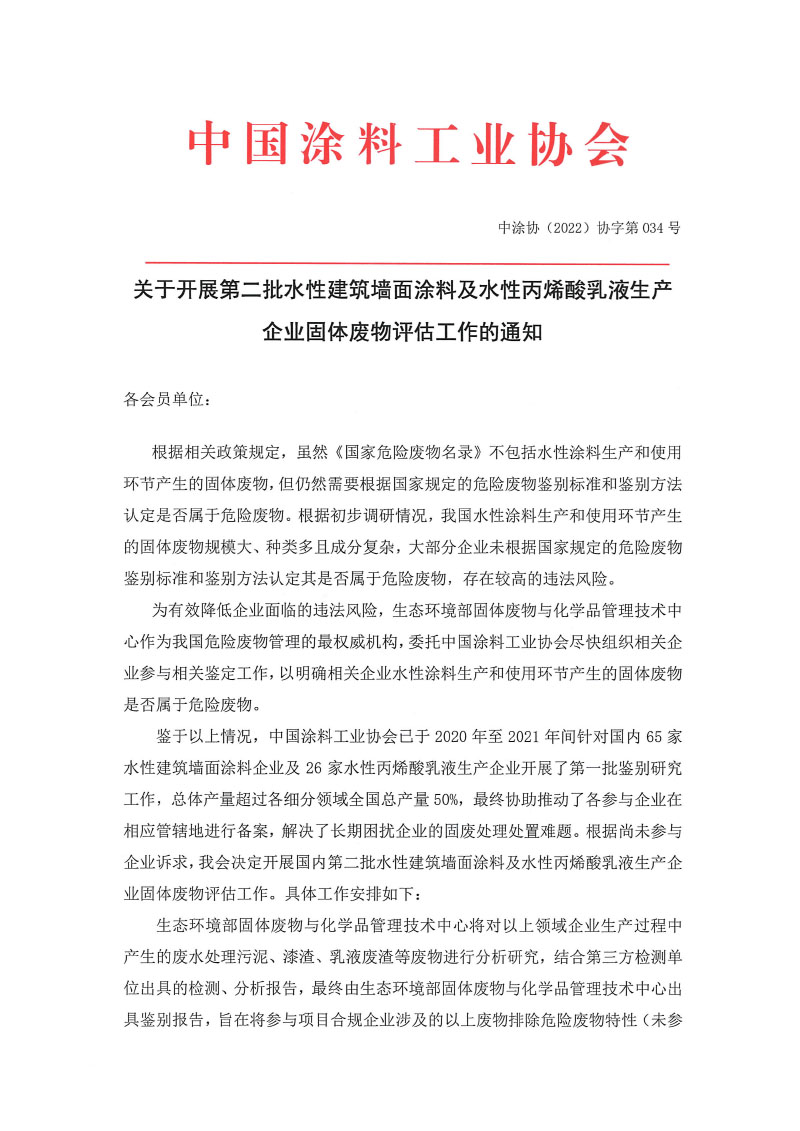 关于开展第二批水性建筑墙面涂料及水性丙烯酸乳液生产企业固体废物评估工作的通知(2022版).pdf