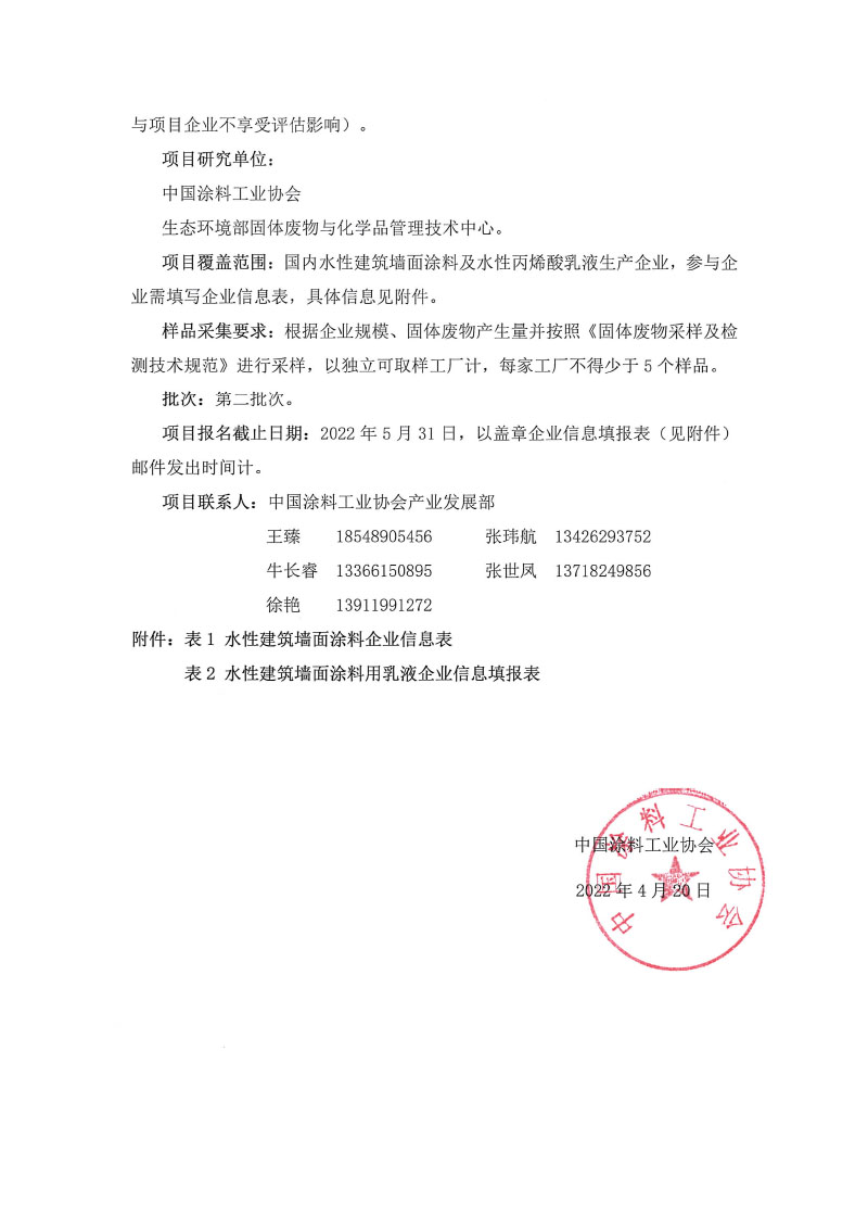 项目覆盖范围:国内水性建筑墙面涂料及水性丙烯酸乳液生产企业,参与企业需填写企业信息表,具体信息见附件。