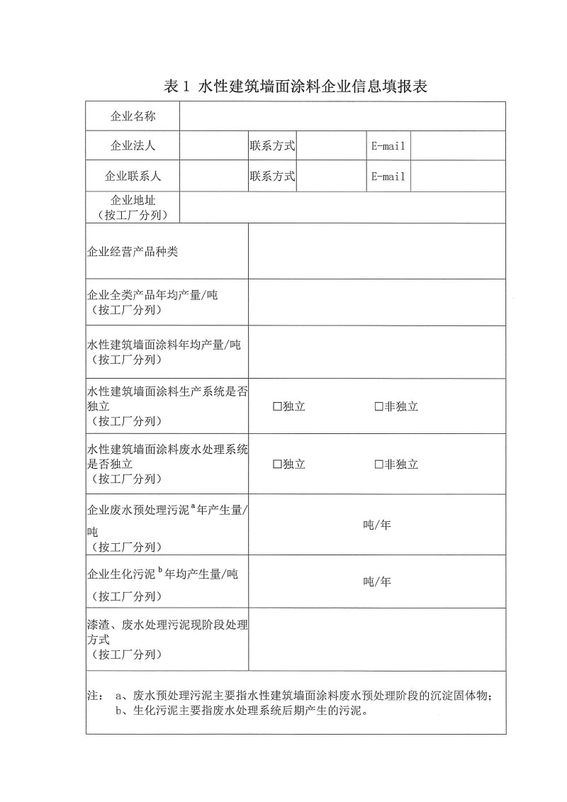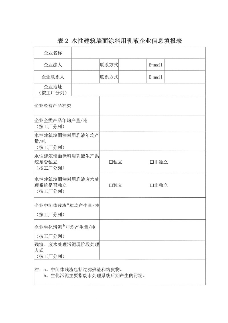 附件:表1 水性建筑墙面涂料企业信息表 表2 水性建筑墙面涂料用乳液企业信息填报
