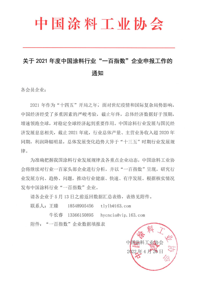 为准确把握我国涂料行业发展规律及各重点企业动态,best365中国官方网站将继续对行业一百家头部企业进行分析,并以“一百指数”呈现,研究行业发展方向、趋势、问题,推动行业健康、快速、有序发展。根据核实情况发布中国涂料行业“一百指数”企业。