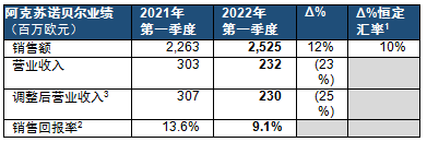 · 调整后营业收入3为2.30亿欧元(2021年同期为3.07亿欧元)