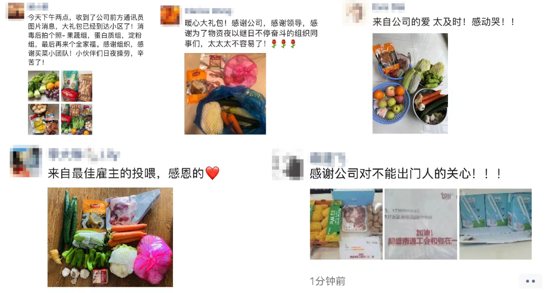 对于封控在家工作的同事们来说,物资的紧缺是不小的挑战,尤其是在封控初期。就在大家为“买菜难”而一筹莫展时,作为中国杰出雇主,朗盛急员工之所急、想员工之所想。由工会牵头,通过人力资源、全球采购与物流、IT、企业传播和GBS等部门同事的协作,朗盛紧急寻找蔬菜食品供应商和物流配送公司,发放蔬菜生鲜大礼包,为居家隔离的员工提供生活保障。当一份沉甸甸的“肉蔬包”送抵同事们的家中,传递的不仅是物资,更是朗盛对员工不掉线的关心。