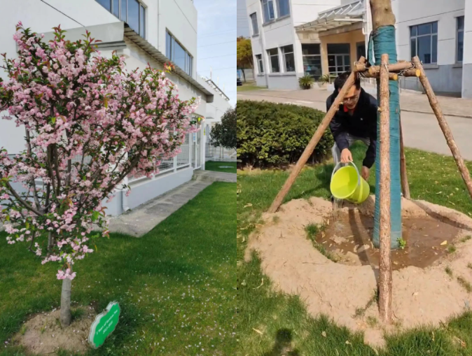 由于没有绿化保养和保洁服务人员,驻厂员工自发给厂区新栽的树浇水,并积极做好区域卫生和消毒。