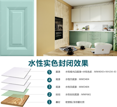 工艺通过2道底漆MWD404加1道面漆MW4043,获得出众的封闭效果。采用MW4043与水性色浆NHJ34-43调色,色彩纯净,令空间氤氲着素净雅致,让人享受生活如诗的清宁。
