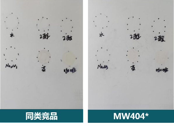 用水性经济环保白漆MWD404和MW404*涂装后的板面经过不同时长的耐水、耐醇性、耐酸性、耐碱性与耐污测试。结果显示:耐化学品测试漆膜表现正常;在耐污性测试中,水性经济环保白漆板面轻微污染,而同类竞品则明显污染。