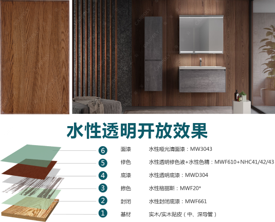 本工艺底漆、面漆分别采用MWD304、MW304*,着色选用水性格丽斯MWF20*和水性色精NHC4*,使用底擦面修工艺,实现色彩均匀、开放自然的板面效果。