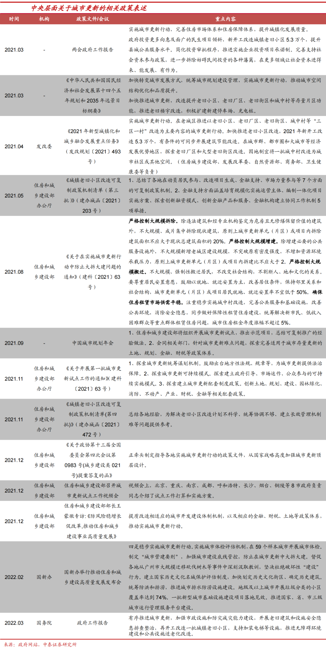 纵观2021年以来中央关于城市更新相关政策的表述,我们不难发现,“严格控制大规模拆除”“严格控制大规模增建”成为主旋律,城镇老旧小区改造被反复强调。
