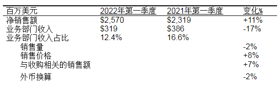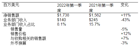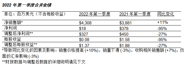 ● 第一季度净利润中包括关闭俄罗斯运营设施相关的税前费用约2.9亿美元,其中大部分为非现金支出。俄罗斯业务约占集团2021年全年和今年第一季度净销售额的1%。