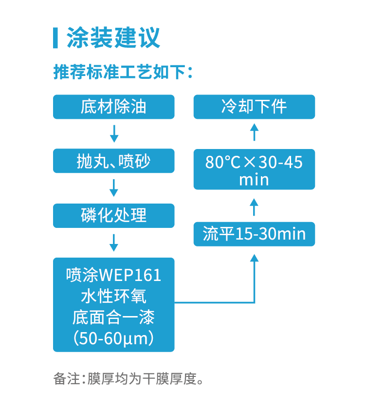 ● 该方案所选用产品WEP161水性环氧底面合一漆,为水性双组份环氧涂料;具有优异的耐水性和耐化学品(油、酸、碱)性能,其中耐盐雾性能>500h,耐老化性能>200h;