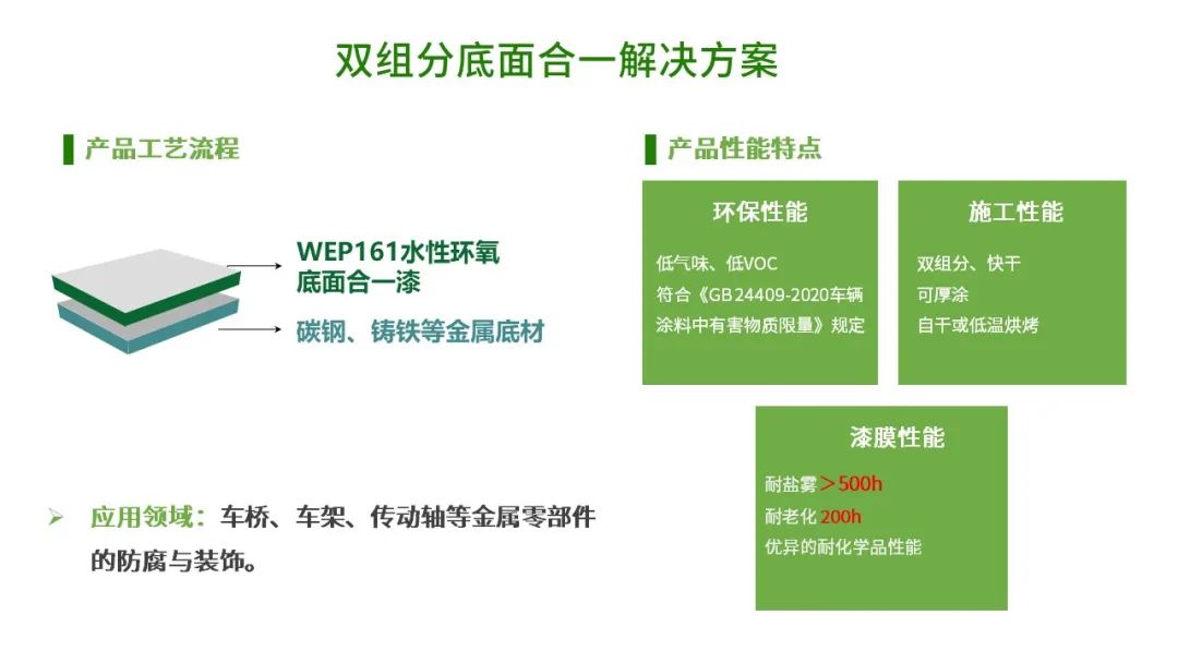 双组分底面合一解决方案,使用的是WEP161水性环氧底面合一漆,产品具有卓越的耐化性和耐盐雾性能,适用于车桥、车架、传动轴等金属零部件的防腐与装饰。
