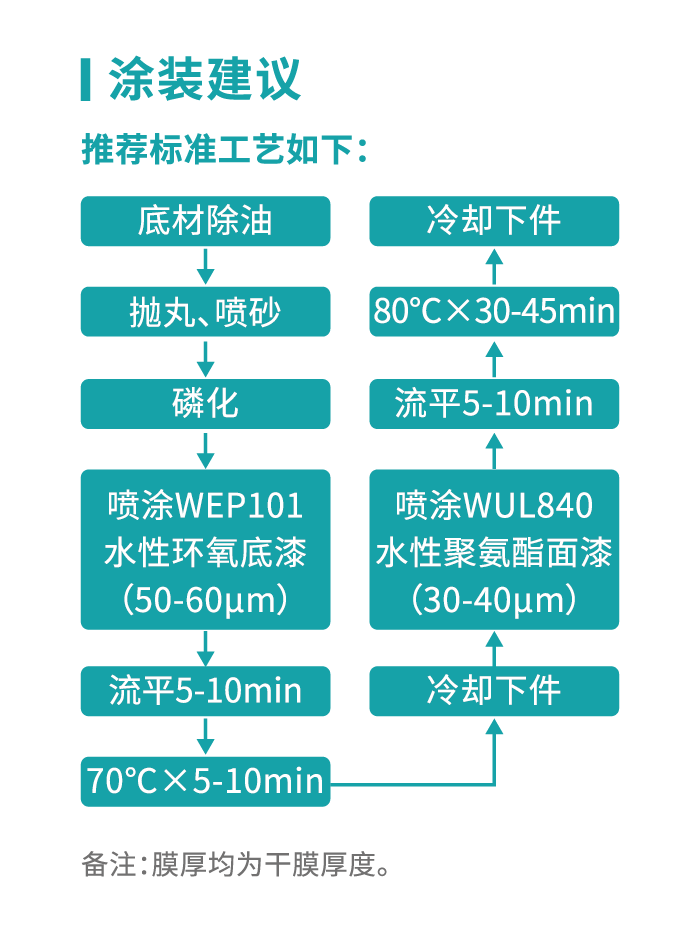 ● 该方案质量稳定可靠,性价比高,市场应用成熟,可满足汽车金属零配件行业的高外观高耐候性能技术要求,是汽车底盘件水性涂装主流解决方案。