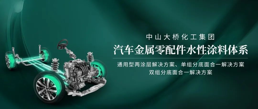 目前,中山大桥化工集团拥有多个成熟应用的水性汽车金属零配件涂料方案,包括通用型两涂层解决方案、单组分底面合一解决方案及双组分底面合一解决方案,可根据不同汽车零部件厂的实际需求,提供定制化配套涂料解决方案,助力汽车金属零配件涂装的环保升级。