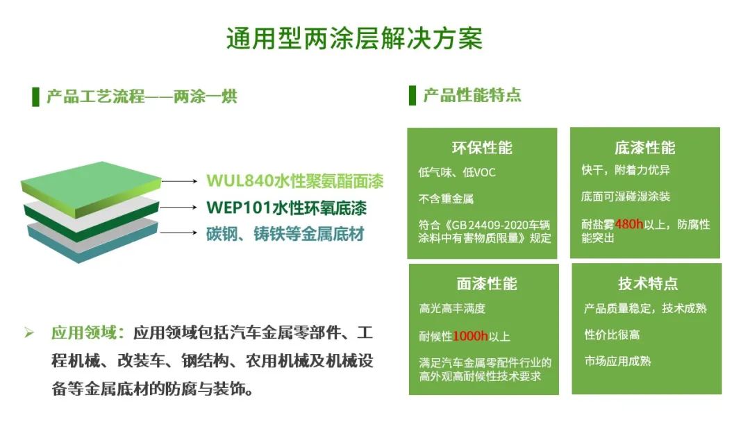 通用型两涂层解决方案是由WEP101水性环氧底漆和WUL840水性聚氨酯面漆配套组成,是典型的金属零配件水性化涂装解决方案。环保性能好,低VOC,符合《GB 24409-2020车辆涂料中有害物质限量》规定。适用于2C1B的涂装工艺,适合汽车金属零部件底材的防腐与装饰。