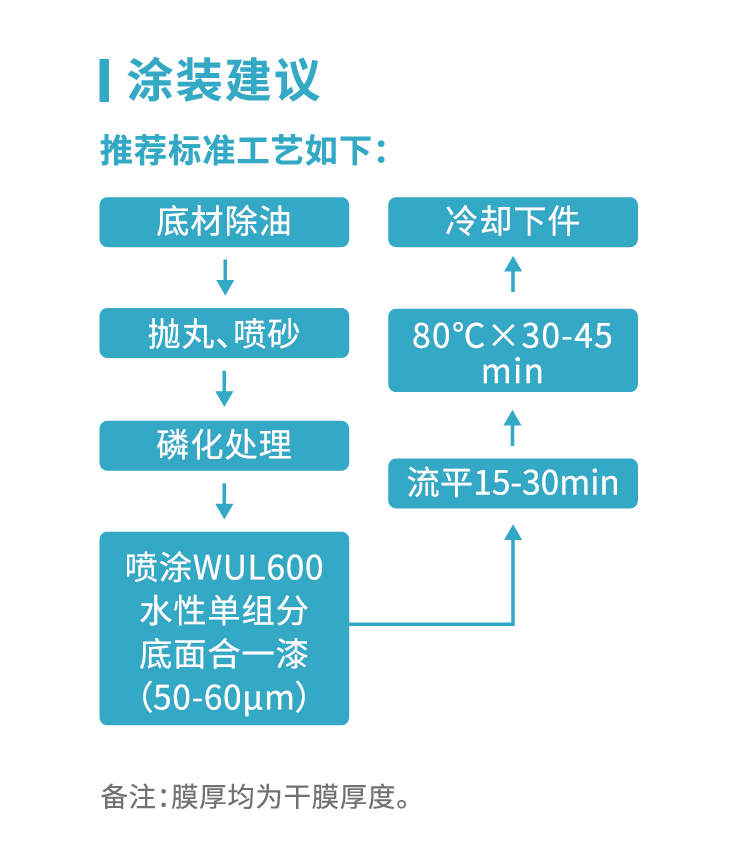 ● 该方案所应用产品WUL600单组分底面合一漆为水性单组分丙烯酸涂料,环保性能出色,气味低,VOC含量低;具有优秀的快干性,耐水性达到240h无锈蚀、无起泡,附着力≤1,耐盐雾性与抗老化性均>500h,表现优异;