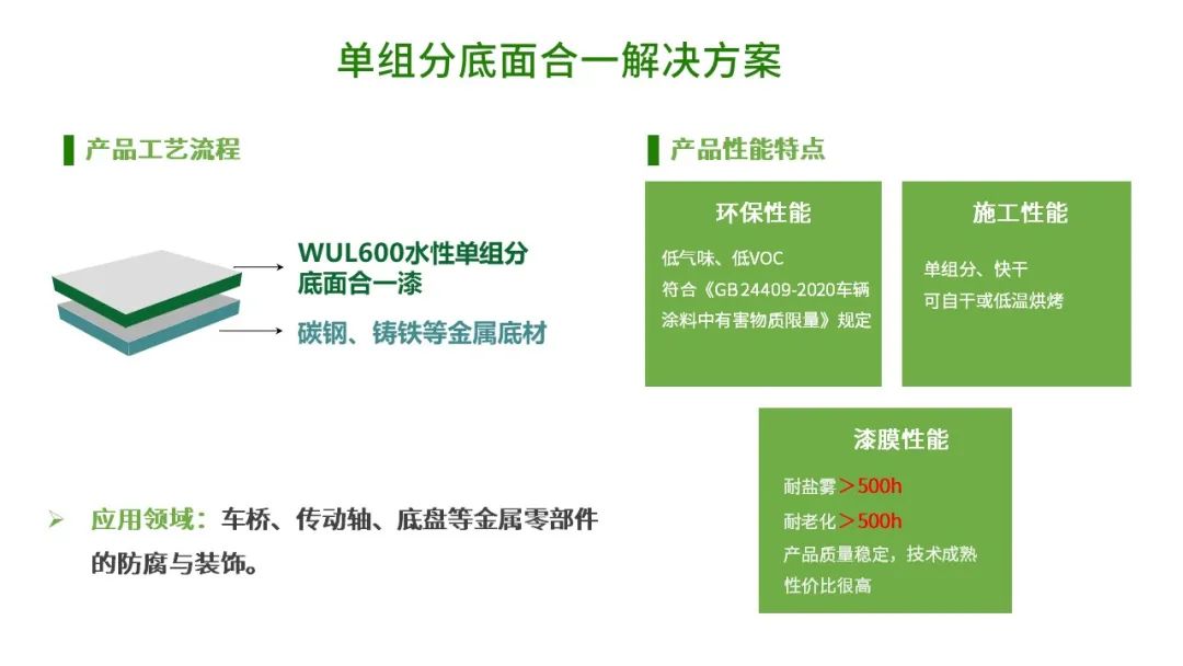 单组分底面合一解决方案使用的是WUL600单组分底面合一漆,产品兼具优异的耐盐雾性能和抗老化性能,针对单组分底面合一涂装工艺配套使用。可应用于车桥、传动轴、底盘等金属零部件的防腐与装饰。