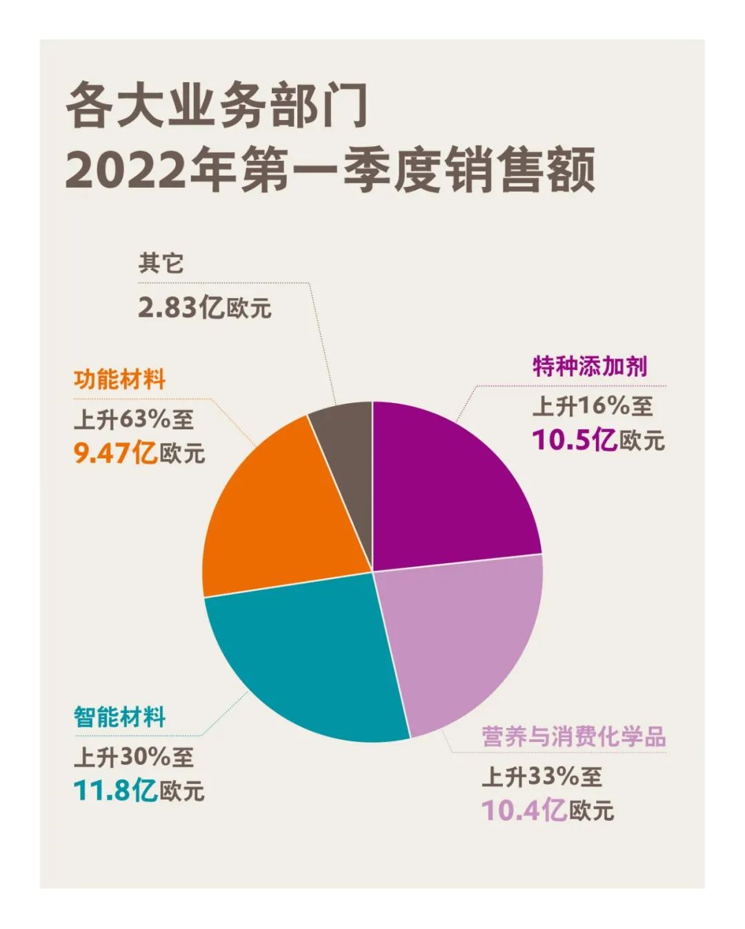 第一季度销售额增长33%,达10.4亿欧元。动物营养必需氨基酸在全球范围内市场需求高涨,销售额显著增长。医疗健康、护理品相关产品销售额增长显著,特别是药物传递技术和化妆品活性成分两大业务发展态势向好。得益于良好的价格策略,营养与消费化学品业务部门调整后EBITDA增长55%,达2.22亿欧元。