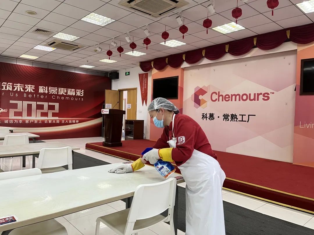 一丝不苟的消杀是保证员工生产生活安全最坚实的屏障。科慕常熟工厂制定了严格、细致、科学的消杀流程,并且要求在重要消杀节点拍摄照片或录像,保存于特定服务器至少3个月时间。