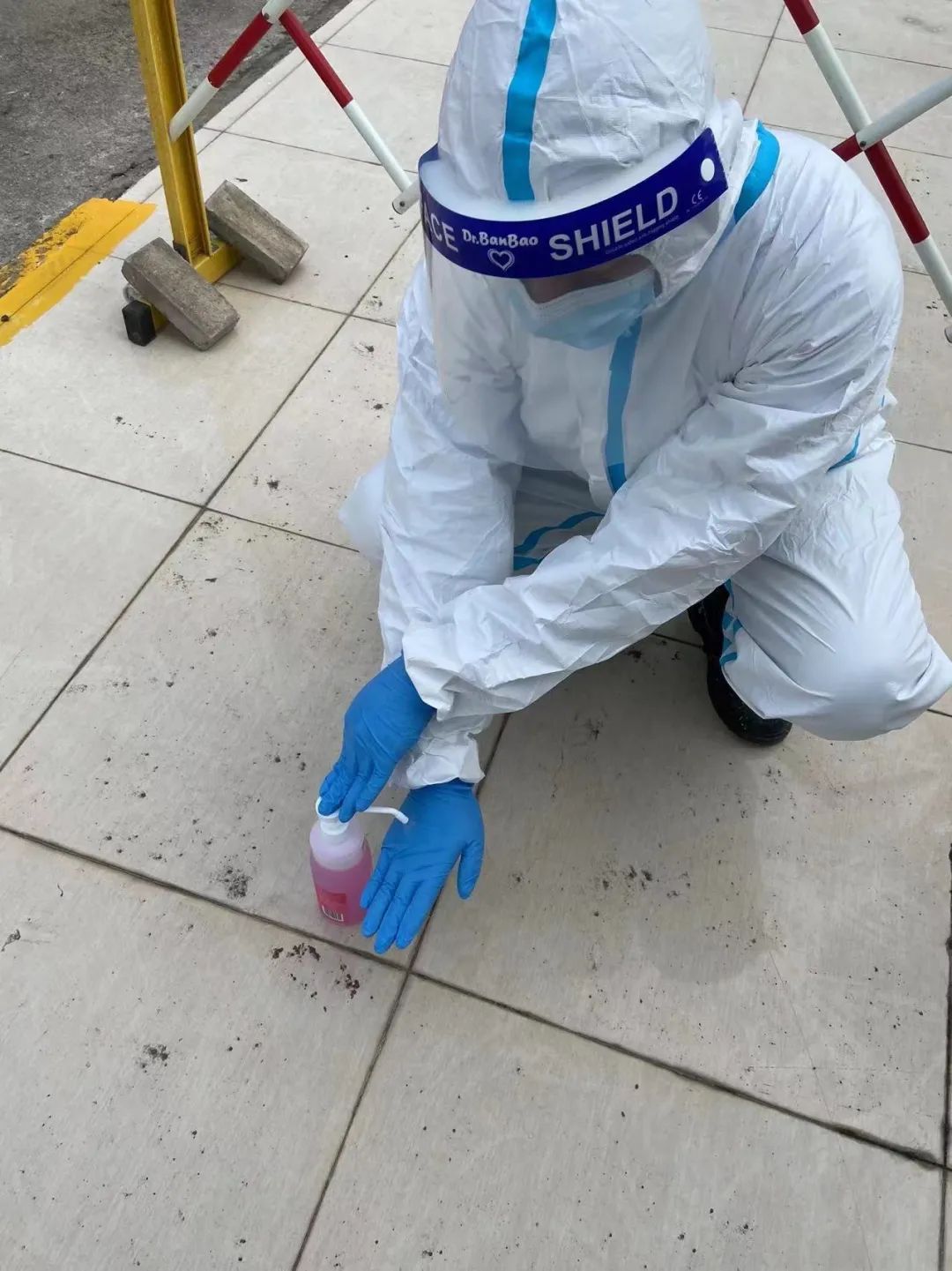 06 消杀人员按要求进行手部洗消后,脱去防护用具,一次性防护用具丢入废弃防疫物资回收桶。