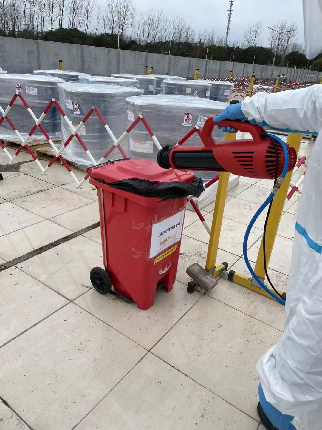 05 消杀完物料后,依次对叉车、消杀放置区域周边道路、消杀人员所佩戴防护用具、喷桶、废弃防疫物资回收桶进行最后的消杀。