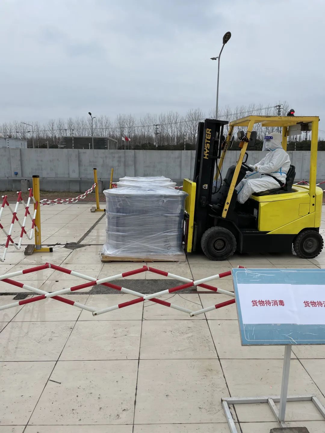 02 消杀人员穿戴好消杀防护用品,二次检查无误后将进口物料叉运至待消杀区域。