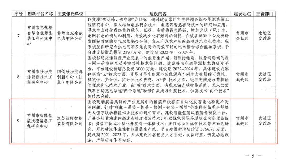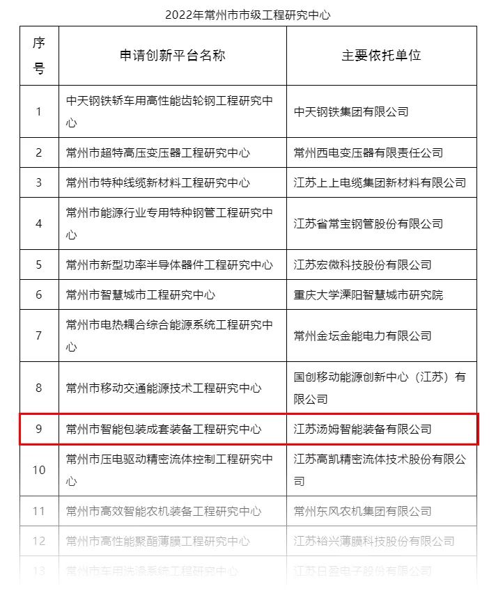 2022年4月底,江苏汤姆集团“常州市智能包装成套装备工程研究中心”经常州市发改委认定,入选2022年常州市工程研究中心。