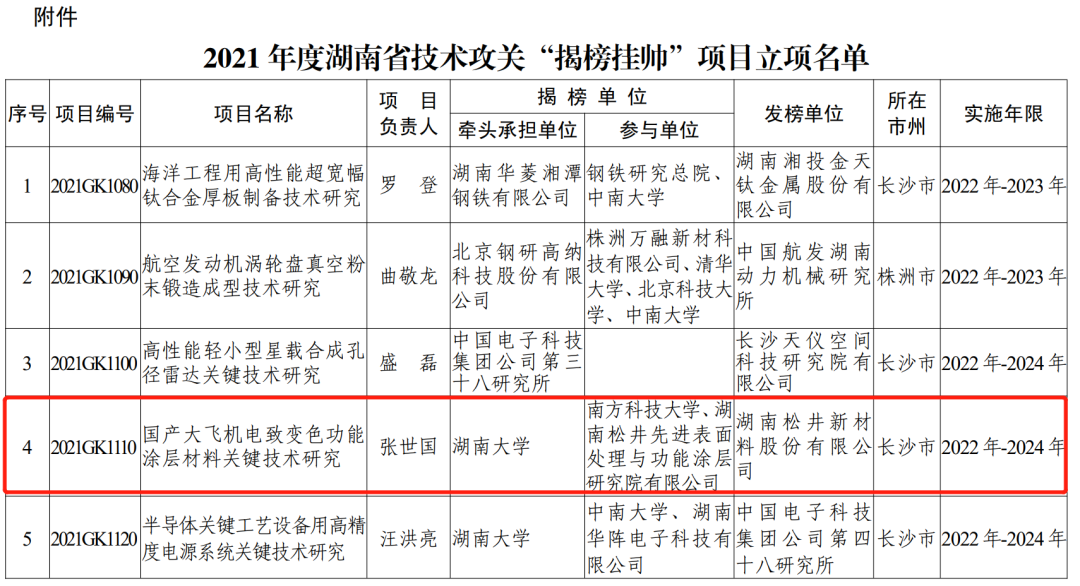 近日,由松井股份发榜的“国产大飞机电致变色功能涂层材料关键技术研究”项目,成功在2021年度湖南省技术攻关“揭榜挂帅”项目中获得立项。
