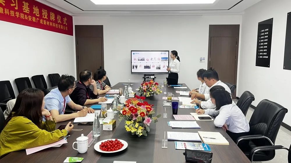 广成科技技术部陈部长介绍公司概况及产品 其次,黄书记介绍了化学与材料工程学院概况,学院成立于2013年,依托材料科学与应用学科,现有应用化学、无机非金属材料工程、材料科学与工程、新能源材料与器件等4个专业,其中应用化学专业为安徽省一流专业建设点、省级特色专业。学院师资力量雄厚,现有正高级职称6人、副高19人,博士43人,硕士生导师7人;就业岗位主要为化工生产、科技研发、产品检测和推广等岗位。 最后,校企双方就科技创新、教学实践、社会实践和学生就业四个方面进行交流,开展长期全面合作,共同构建产学研结合的创新体系,实现安徽科技学院的人才智力、研发能力以及先进科研成果与广成科技产品技术创新发展需求对接,将科研成果转化为生产力,为广成科技社会发展提供人才和智力支持,努力实现专业、产业相互促进、共同发展、产学研共赢。