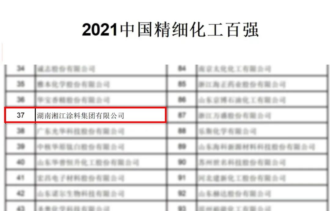 近日,中国精细化工产业峰会暨中国精细化工百强发布会通过线上成功举办,并发布“2021中国精细化工百强”名单。湖南湘江涂料集团有限公司凭借强劲企业实力连续四年登榜,位列第37位。