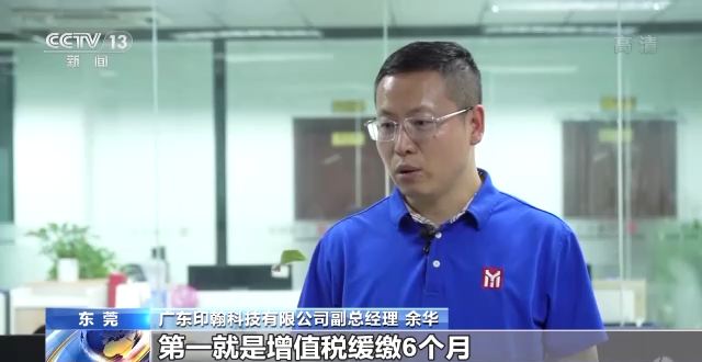 广东印翰科技有限公司副总经理 余华:第一就是增值税缓缴6个月,第二就是“六税两费”减免50%,这两个税加起来的话,对我们整个公司起到一个雪中送炭的效果。