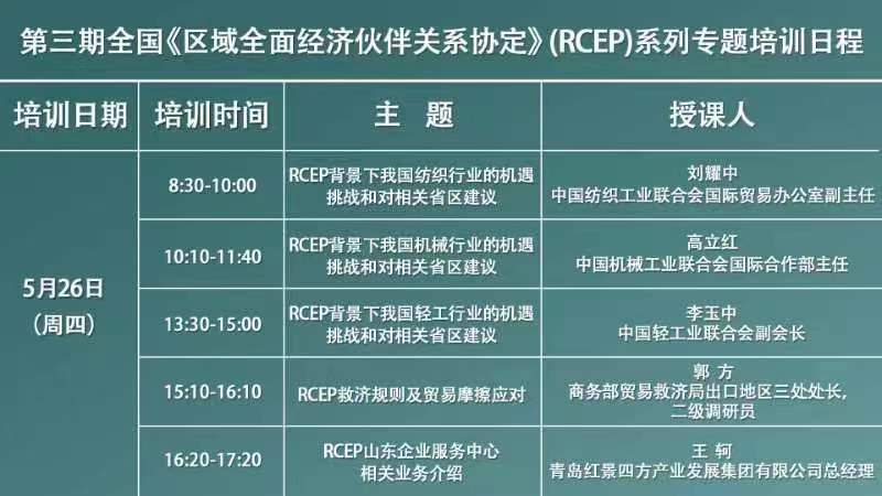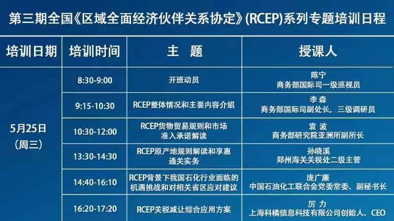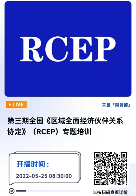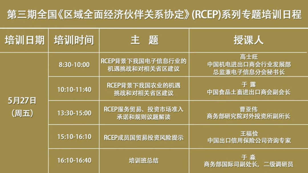 为助力企业发展,促进区域合作,由商务部主办、重点面向企业的第三期《区域全面经济伙伴关系协定》(RCEP)系列专题培训,将于5月25-27日通过线上直播的方式进行。具体事宜如下: