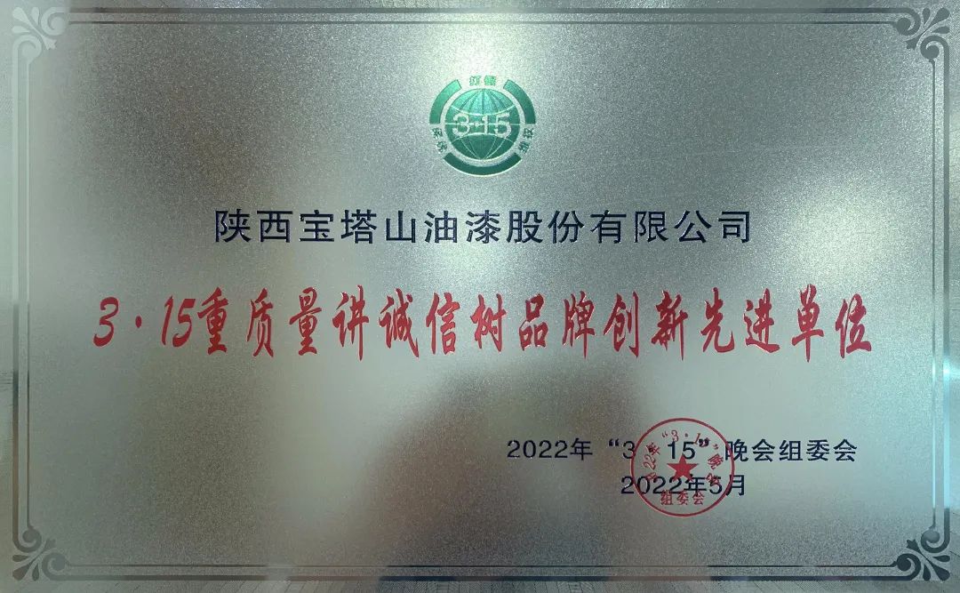 晚会上,宝塔山漆凭借在重质量,讲诚信,聚力创新,依法纳税,履行合同,关爱员工、行业治理中的突出表现,荣获陕西“3·15重质量讲诚信树品牌创新先进单位”,被3·15晚会组委会授予奖牌和证书。