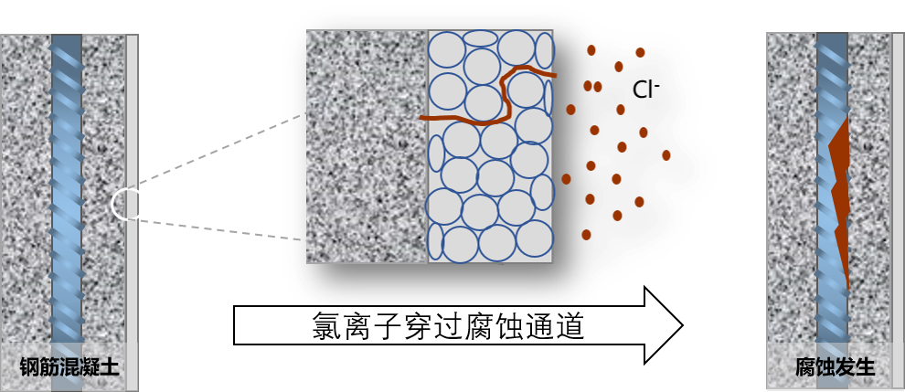 氯离子的腐蚀是沿海混凝土建筑物及桥梁结构等腐蚀破坏的最重要的原因之一。氯离子可能来源于外部海水、海洋大气环境、路面融雪剂等,也可能来源于不规范的使用了海砂作为建筑用沙。氯离子是一种穿透性极强的腐蚀介质,即使是碱性条件下,氯离子引起的点蚀依然会发生。