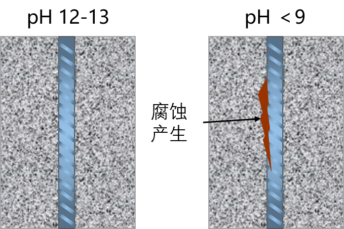 水泥的水化产物:氢氧化钙是一种高碱性物质(pH>12.5),可以钝化钢筋表面阻止钢筋的腐蚀。但当二氧化碳等酸性气体通过渗入混凝土与氢氧化钙反应成碳酸钙时,就产生了混凝土的“碳化”。大量碳酸钙生成时,混凝土内部的碱性环境就会遭到破坏,达到一定程度时,混凝土内的钢筋就会因为没有碱性环境的保护而产生腐蚀。