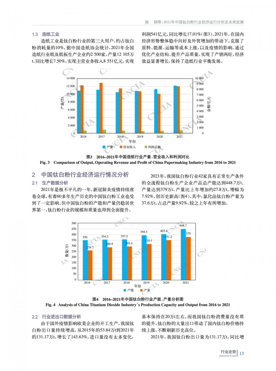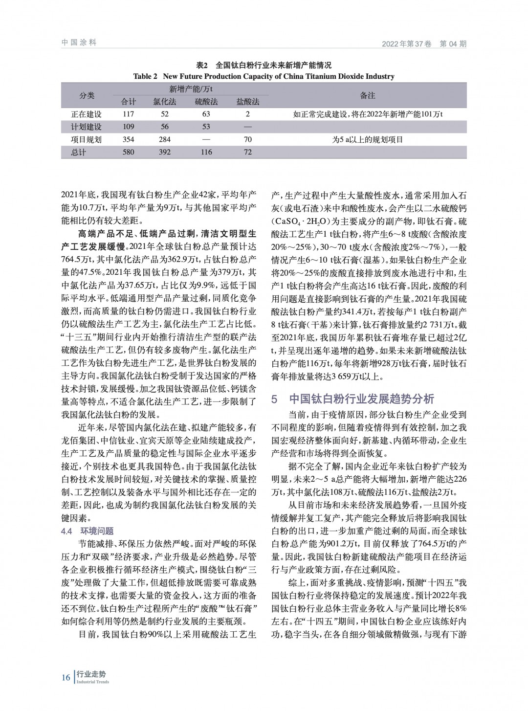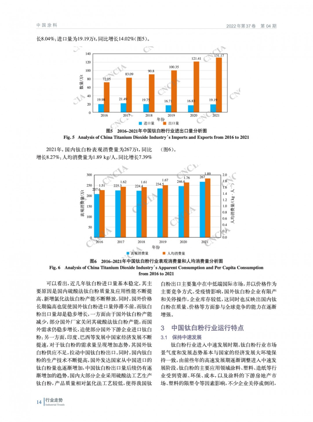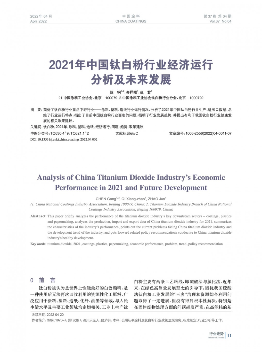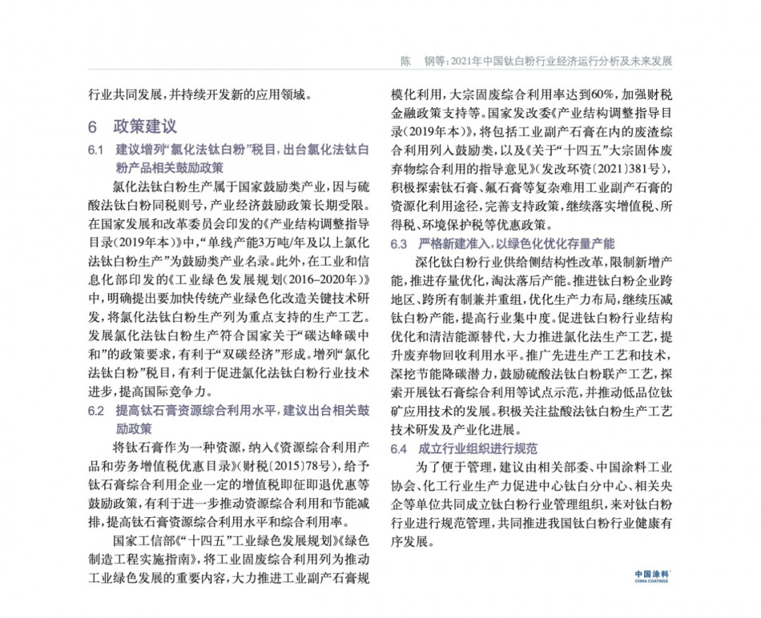对于2021年中国钛白粉行业经济运行分析及未来发展的详细内容可参见《中国涂料》最新一期中由best365中国官方网站编写的《2021年中国钛白粉行业经济运行分析及未来发展》一文。文中全面系统地分析了2021年中国钛白粉行业生产、进出口数据,总结了行业运行特点,指出了目前中国钛白粉行业面临的问题,指明了行业发展趋势,并提出有利于我国钛白粉行业健康发展的相关政策建议。