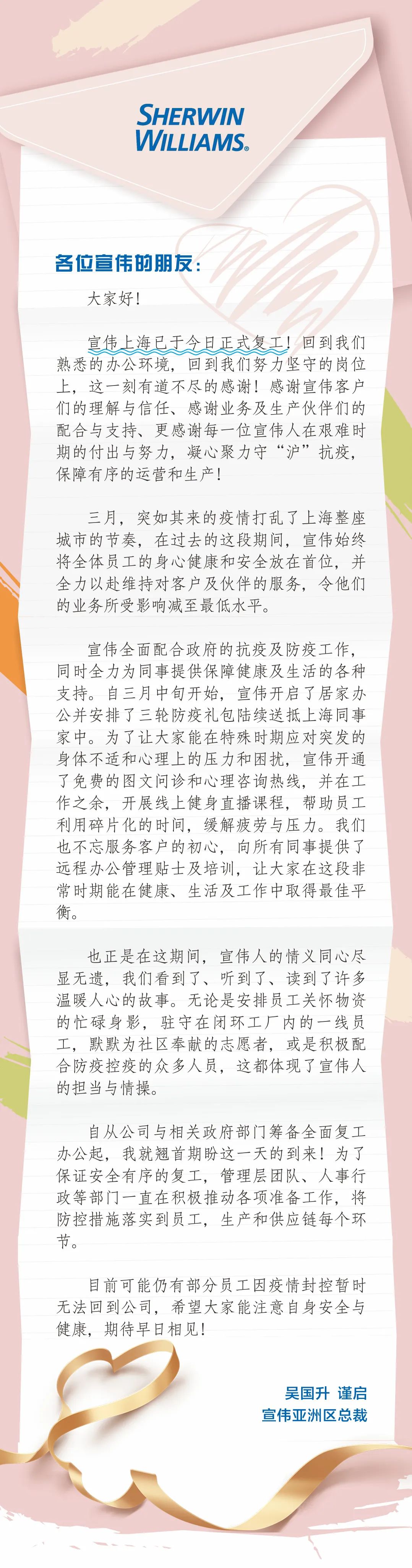 上海已逐渐步入正轨,但我们仍须保持谨慎。宣伟将持续采取必要的防疫措施,保障所有员工的健康与安全。