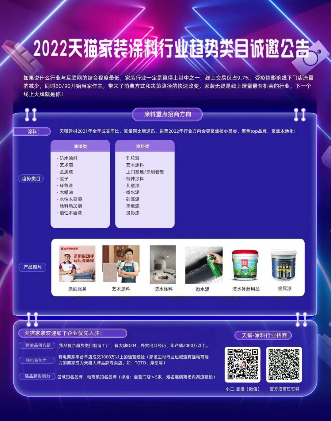 由此,2022天猫家装涂料行业趋势类目诚邀您的入驻!