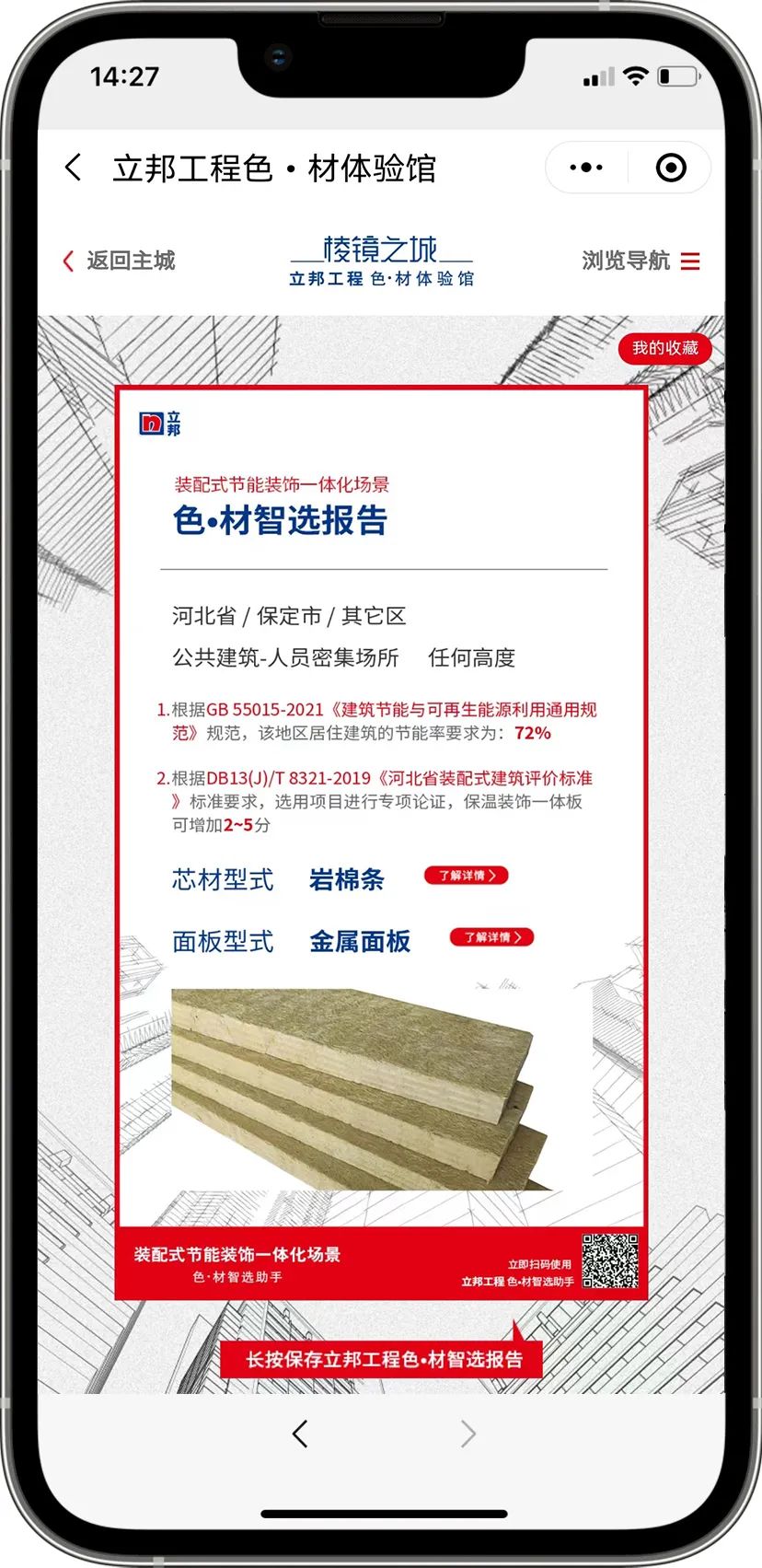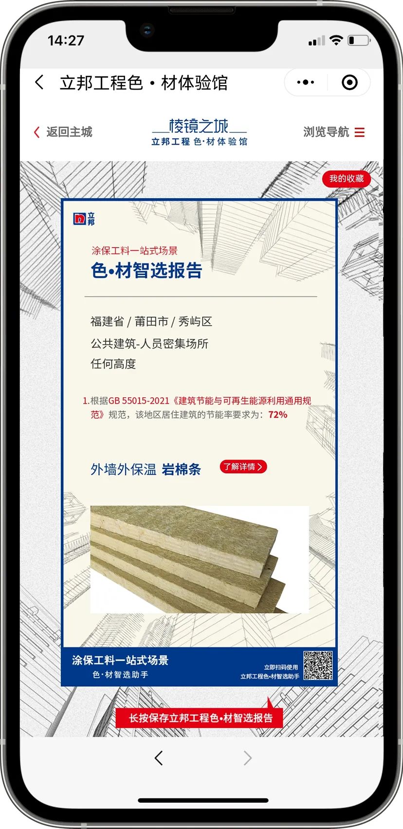 立邦工程色·材体验馆调用立邦工程官网的多个端口,将全体系产品、效果选型工具、创彩美色800色卡等多个工具嵌入其中,便捷的选型参考,更易于移动端随查随用。除此之外,立邦工程色·材体验馆还开发了包括色·材智拍、案例地图等一系列“随手查”工具,打破虚拟与现实的第四面墙,与移动端一起同时满足移动办公和案头工作的需求。
