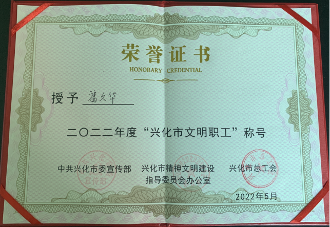 近日,兴化市总工会发文通知,双乐颜料股份有限公司潘久华获2022年兴化市“文明职工”、四分厂化合班组获2022年兴化市“文明班组”称号。