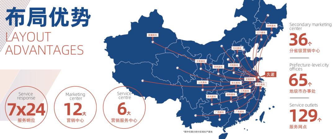 在服务保障环节,久诺全国布局优势凸显,全国各地(省级)营销中心、营销服务中心、地级市办事处、服务网点,省市区镇逐级铺设,配合7X24小时服务响应机制与专人专项目定制化服务模式,以全面高效的全国服务网络促进产业价值链融合。