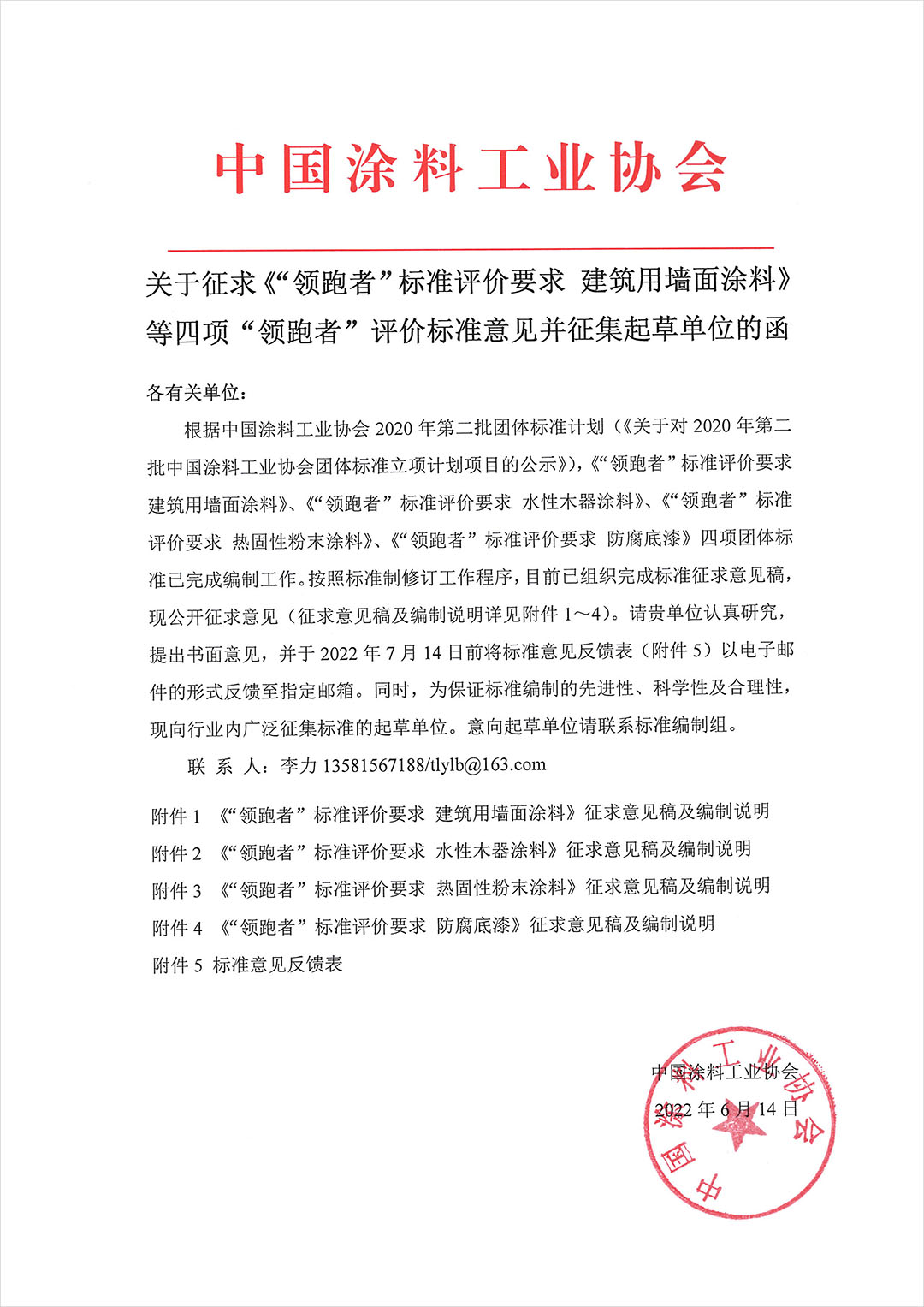 根据best365中国官方网站2020年第二批团体标准计划(《关于对2020年第二批best365中国官方网站团体标准立项计划项目的公示》),《“领跑者”标准评价要求 建筑用墙面涂料》、《“领跑者”标准评价要求 水性木器涂料》、《“领跑者”标准评价要求 热固性粉末涂料》、《“领跑者”标准评价要求 防腐底漆》四项团体标准已完成编制工作。按照标准制修订工作程序,目前已组织完成标准征求意见稿,现公开征求意见(征求意见稿及编制说明详见附件1~4)。请贵单位认真研究,提出书面意见,并于2022年7月14日前将标准意见反馈表(附件5)以电子邮件的形式反馈至指定邮箱。同时,为保证标准编制的先进性、科学性及合理性,现向行业内广泛征集标准的起草单位。意向起草单位请联系标准编制组。