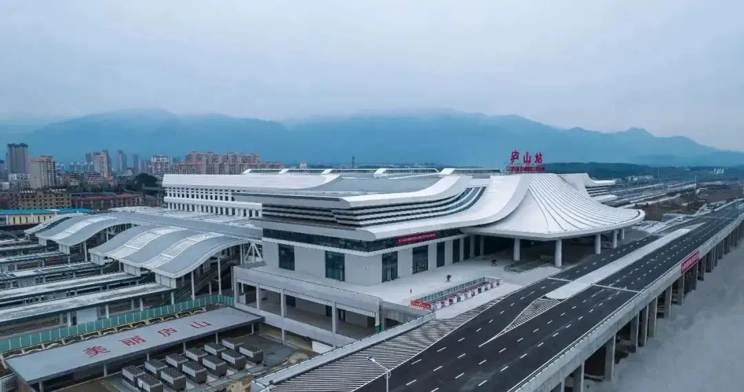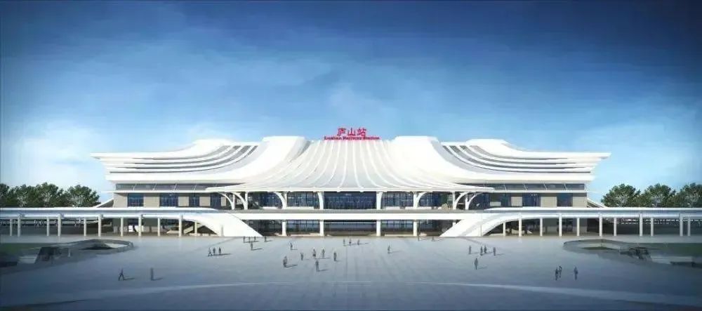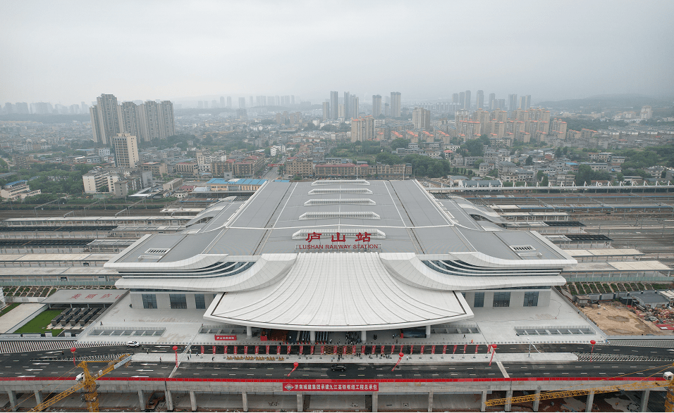 2022年4月底,九江市首座高铁站——庐山站西站房正式开通运营。站台设计融入庐山云雾和山水的柔美形态,色彩明快,意境唯美,与远处的自然景观遥相呼应,于山影水语间大放异彩!