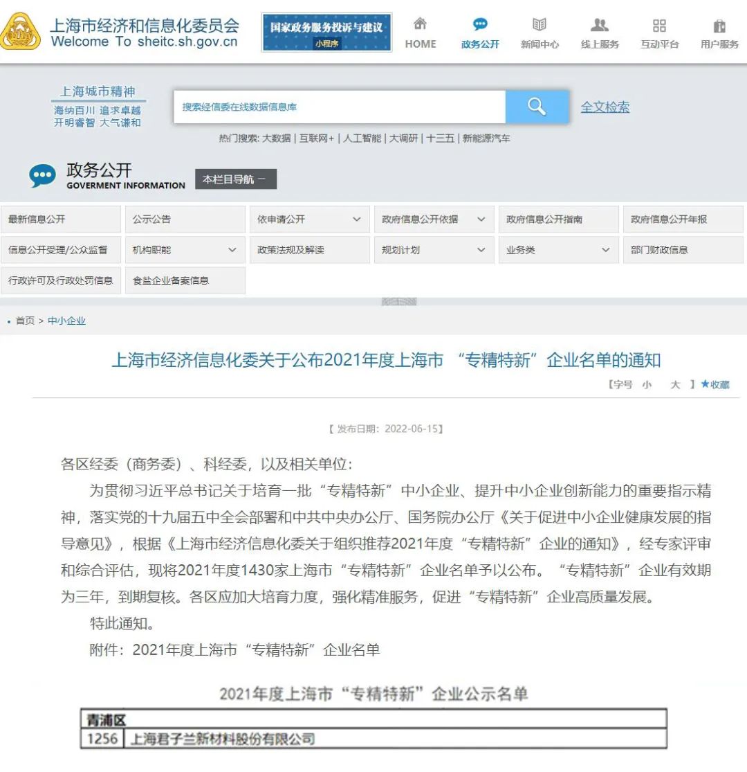 近日,上海市经济和信息化委员会发布了2021年度上海市“专精特新”企业公示名单,上海君子兰新材料股份有限公司荣登“专精特新”企业榜单!