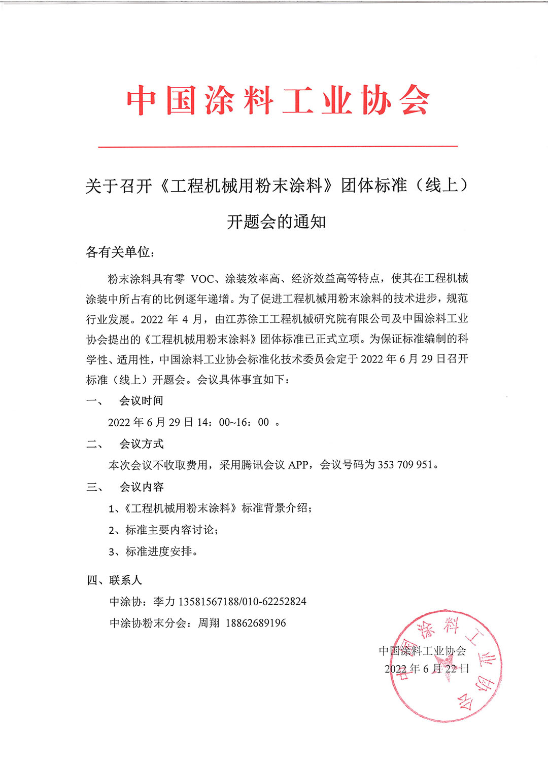 粉末涂料具有零VOC、涂装效率高、经济效益高等特点,使其在工程机械涂装中所占有的比例逐年递增。为了促进工程机械用粉末涂料的技术进步,规范行业发展。2022年4月,由江苏徐工工程机械研究院有限公司及best365中国官方网站提出的《工程机械用粉末涂料》团体标准已正式立项。为保证标准编制的科学性、适用性,best365中国官方网站标准化技术委员会定于2022年6月29日召开标准(线上)开题会。会议具体事宜如下: