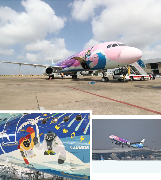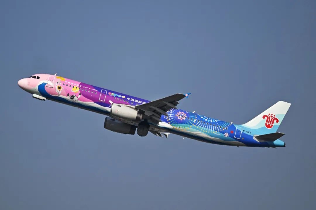 “消博号”主题彩绘飞机选用南航旗下空客A321机型,由南航集团与海南国际经济发展局合作推出。它的机身以70多种斑斓色彩描绘着在吉祥物们在“南繁、深海、航天”场景下的灵动画面,寓意着消博会热情迎接全球企业和消费者的到来。