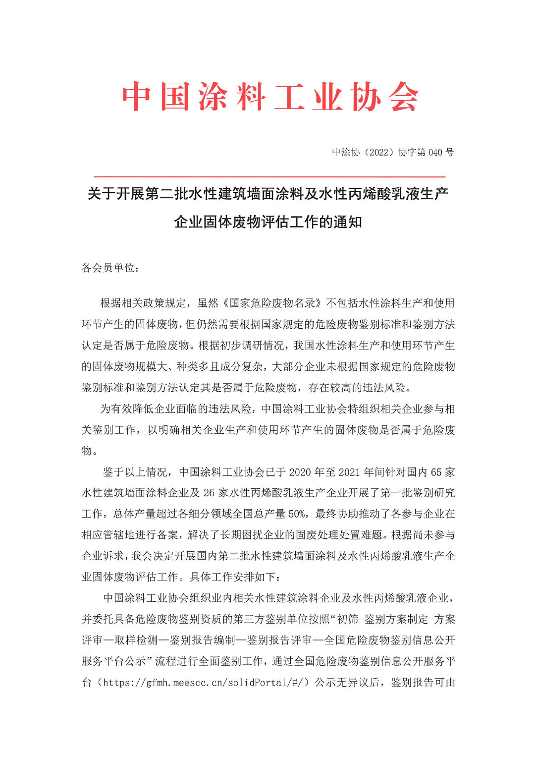 关于开展第二批水性建筑墙面涂料及水性丙烯酸乳液生产企业固体废物评估工作的通知