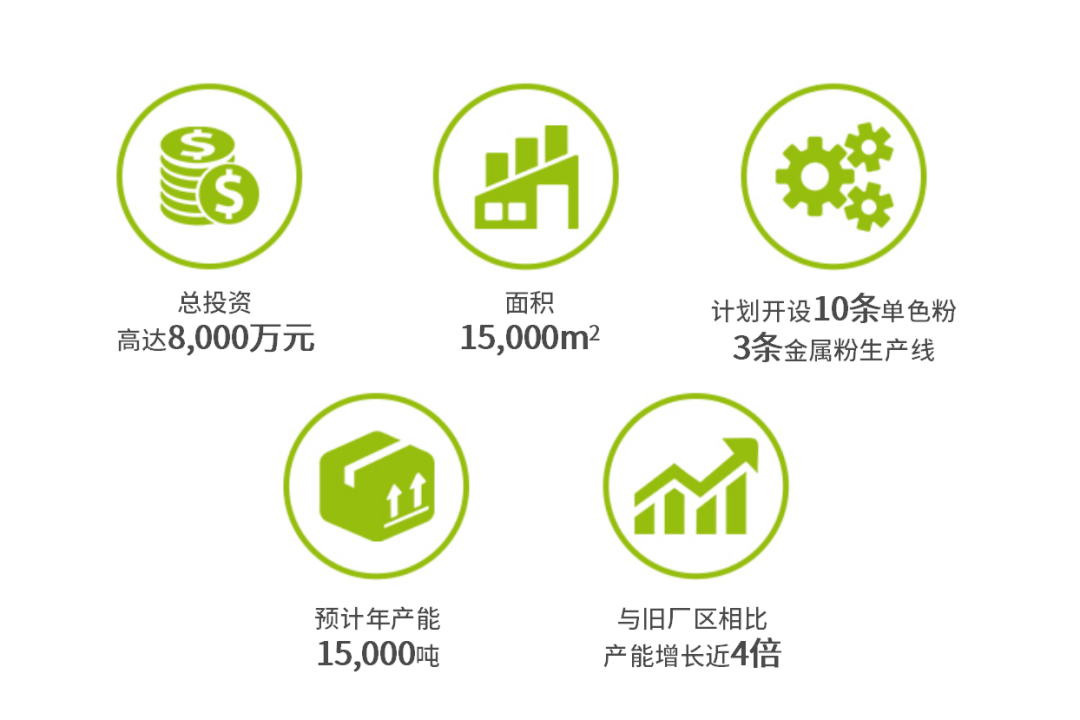 老虎新材料自主建设的眉山新工厂总投资高达8,000万元,面积15,000㎡,计划开设10条单色粉、3条金属粉生产线,预计年产能15,000吨,与旧厂区相比产能增长近4倍。自此,老虎新材料坐拥四川眉山,联合江苏太仓、广东清远生产基地,形成中国三大地域支柱辐射全国。